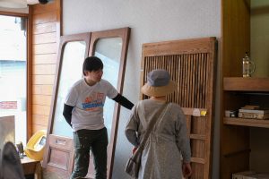 TSURUYA:福生市の旧米軍ハウスの活用に関わる中で、家主さんが取り壊しを選ばれることも多いんです。そこで出る材は、リノベーションの際に使えるであろう貴重な材でした。それが廃材として捨てられていくのはもったいないということで、古材の再利用にも取り組むようになりました。そうこうしていくと回収した古材の在庫が増えていき、倉庫もいっぱいに。なんとか材を有効活用できる場所、使ってくれる人に出会う機会はないかと考えていた時につるやの話を聞き、見学会に参加したんです。貴重な町屋建築であり、広い空間を確保できることから、ここで古材を展示販売しようと決めたんです。